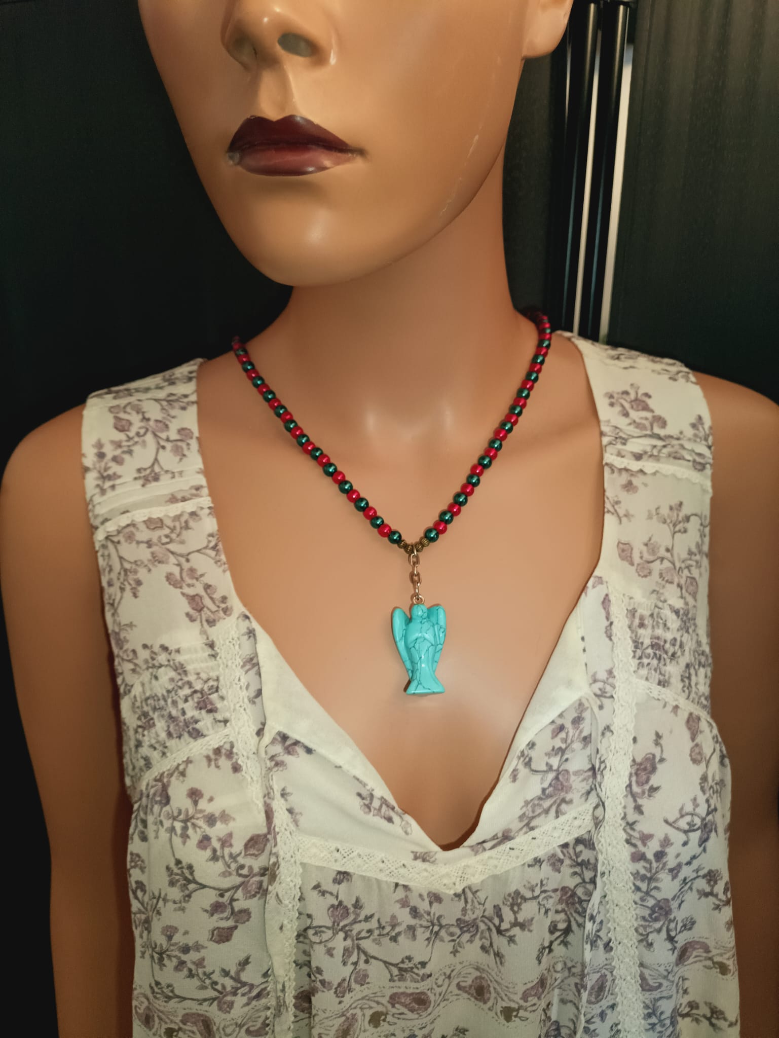 Fein abgestimmte Glaswachsperlen in Blaugrün und Rubinrot bilden eine harmonische Komposition, die den Türkisstein in der Mitte elegant hervorhebt. Diese etwa 60 cm lange Halskette kombiniert modernen Chic mit spiritueller Symbolik. Ob als besonderes Geschenk oder als täglicher Begleiter – der stabile Verschluss und die hochwertige Verarbeitung machen sie zum Lieblingsstück für stilbewusste Träger/Trägerinnen.